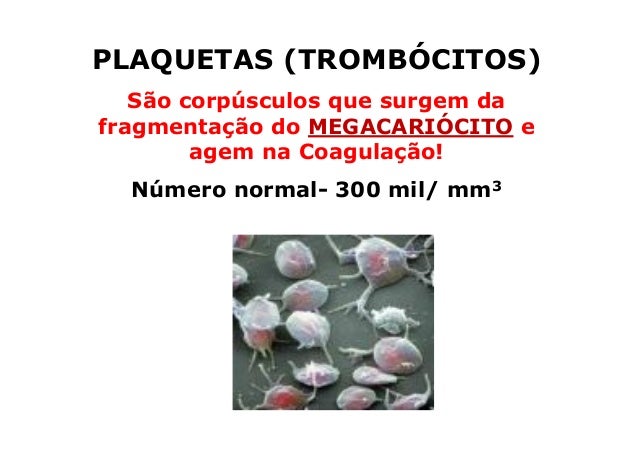 99. 99. PLAQUETAS (TROMBÓCITOS) São corpúsculos que surgem dafragmentação do MEGACARIÓCITO e agem na Coagulação! Número normal- 300 mil/ mm3