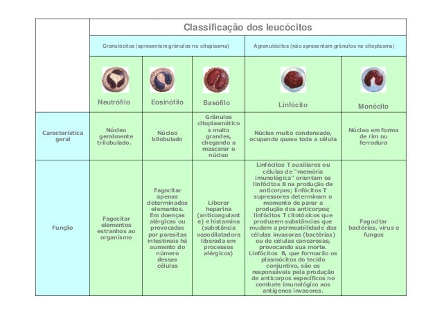 100. 100. Classificação dos leucócitos Granulócitos (apresentam grânulos no citoplasma) Agranulócitos (não apresentam grânulos no citoplasma) Neutrófilo Eosinófilo Basófilo Linfócito Monócito Grânulos citoplasmático Núcleo s muito Núcleo em formaCaracterística Núcleo Núcleo muito condensado, geralmente grandes, de rim ou geral bilobulado ocupando quase toda a célula trilobulado. chegando a ferradura mascarar o núcleo Linfócitos T auxiliares ou células de “memória imunológica” orientam os linfócitos B na produção de Fagocitar anticorpos; linfócitos T apenas supressores determinam o determinados Liberar momento de parar a elementos. heparina produção dos anticorpos; Em doenças (anticoagulant linfócitos T citotóxicos que Fagocitar alérgicas ou e) e histamina produzem substâncias que Fagocitar elementos Função provocadas (substância mudam a permeabilidade das bactérias, vírus e estranhos ao por parasitas vasodilatadora células invasoras (bactérias) fungos organismo intestinais há liberada em ou de células cancerosas, aumento do processos provocando sua morte. número alérgicos) Linfócitos B, que formarão os dessas plasmócitos do tecido células conjuntivo, são os responsáveis pela produção de anticorpos específicos no combate imunológico aos antígenos invasores.