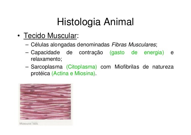 103. 103. Histologia Animal• Tecido Muscular: – Células alongadas denominadas Fibras Musculares; – Capacidade de contração (gasto de energia) e relaxamento; – Sarcoplasma (Citoplasma) com Miofibrilas de natureza protéica (Actina e Miosina).