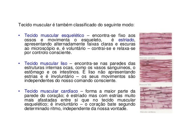 104. 104. Tecido muscular é também classificado do seguinte modo:• Tecido muscular esquelético – encontra-se fixo aos ossos e movimenta o esqueleto, é estriado, apresentando alternadamente faixas claras e escuras ao microscópio e, é voluntário – contrai-se e relaxa-se por controlo consciente.• Tecido muscular liso – encontra-se nas paredes das estruturas internas ocas, como os vasos sanguíneos, o estômago e os intestinos. É liso não apresentando estrias e é involuntário – os seus movimentos são independentes do nosso comando consciente.• Tecido muscular cardíaco – forma a maior parte da parede do coração; é estriado mas com estrias muito mais afastadas entre si que no tecido muscular esquelético; é involuntário – o coração bate segundo determinado ritmo, independente da nossa vontade.