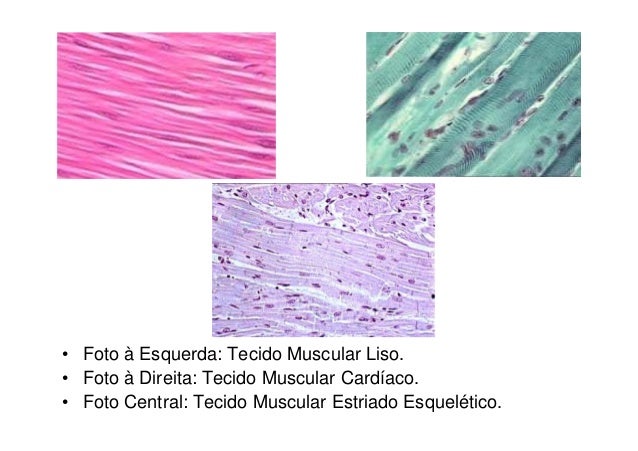 106. 106. • Foto à Esquerda: Tecido Muscular Liso.• Foto à Direita: Tecido Muscular Cardíaco.• Foto Central: Tecido Muscular Estriado Esquelético.