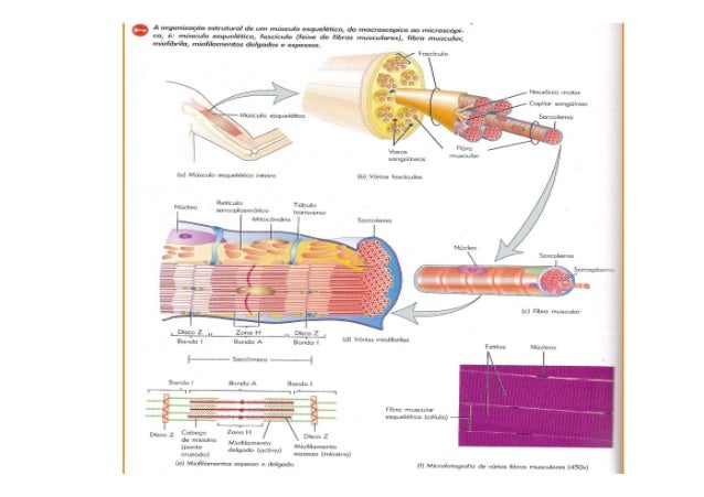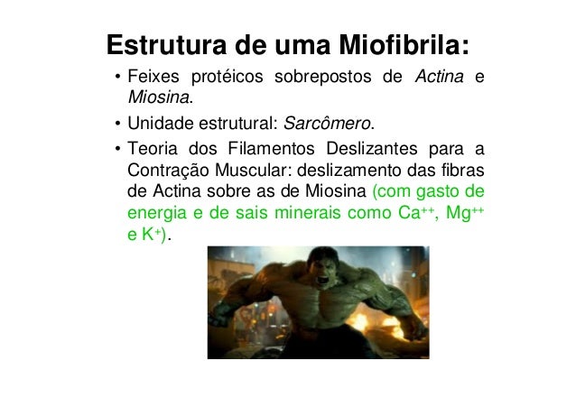 107. 107. Estrutura de uma Miofibrila:• Feixes protéicos sobrepostos de Actina e Miosina.• Unidade estrutural: Sarcômero.• Teoria dos Filamentos Deslizantes para a Contração Muscular: deslizamento das fibras de Actina sobre as de Miosina (com gasto de energia e de sais minerais como Ca++, Mg++ e K+).