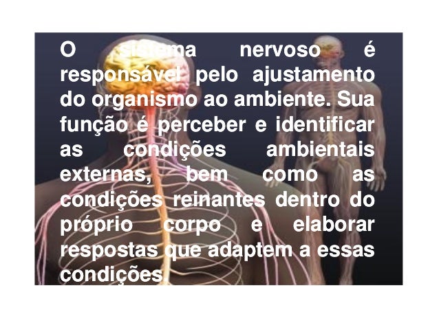 118. 118. O sistema nervoso éresponsável pelo ajustamentodo organismo ao ambiente. Suafunção é perceber e identificaras condições ambientaisexternas, bem como ascondições reinantes dentro dopróprio corpo e elaborarrespostas que adaptem a essascondições.