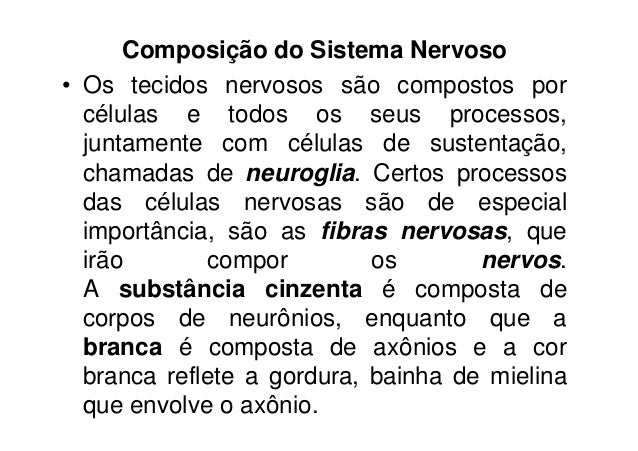 119. 119. Composição do Sistema Nervoso• Os tecidos nervosos são compostos por células e todos os seus processos, juntamente com células de sustentação, chamadas de neuroglia. Certos processos das células nervosas são de especial importância, são as fibras nervosas, que irão compor os nervos. A substância cinzenta é composta de corpos de neurônios, enquanto que a branca é composta de axônios e a cor branca reflete a gordura, bainha de mielina que envolve o axônio.