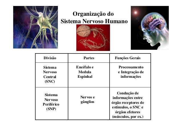120. 120. Organização do Sistema Nervoso HumanoDivisão Partes Funções GeraisSistema Encéfalo e ProcessamentoNervoso Medula e Integração deCentral Espinhal informações (SNC) Sistema Condução de Nervos e informações entre Nervoso gânglios órgão receptores dePeriférico (SNP) estímulos, o SNC e órgãos efetores (músculos, por ex.)