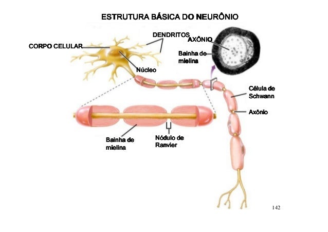 121. 121. ESTRUTURA BÁSICA DO NEURÔNIO DENDRITOS AXÔNIOCORPO CELULAR Bainha de mielina Núcleo Célula de Schwann Axônio Bainha de Nódulo de mielina Ranvier 142