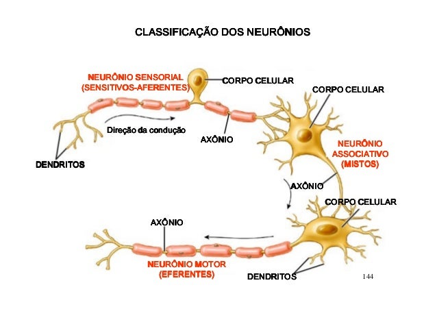 123. 123. CLASSIFICAÇÃO DOS NEURÔNIOS NEURÔNIO SENSORIAL CORPO CELULAR (SENSITIVOS- (SENSITIVOS-AFERENTES) CORPO CELULAR Direção da condução AXÔNIO NEURÔNIO ASSOCIATIVODENDRITOS (MISTOS) AXÔNIO CORPO CELULAR AXÔNIO NEURÔNIO MOTOR (EFERENTES) DENDRITOS 144