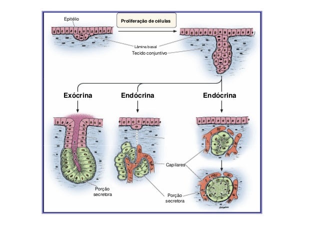 21. 21. Epitélio Proliferação de células Lâmina basal Tecido conjuntivoExócrina Endócrina Endócrina Capilares Porção secretora Porção secretora