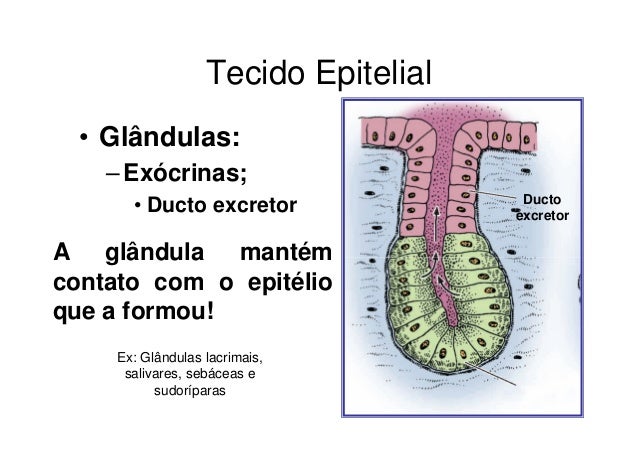 22. 22. Tecido Epitelial • Glândulas: – Exócrinas; Ducto • Ducto excretor excretorA glândula mantémcontato com o epitélioque a formou! Ex: Glândulas lacrimais, salivares, sebáceas e sudoríparas