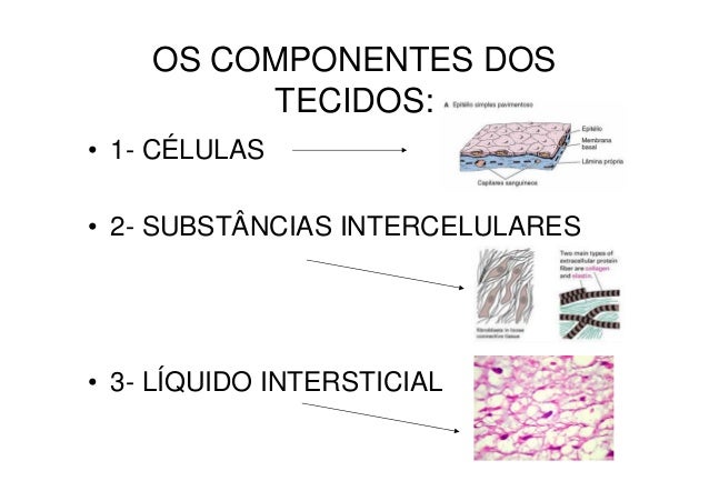 2. 2. OS COMPONENTES DOS TECIDOS:• 1- CÉLULAS• 2- SUBSTÂNCIAS INTERCELULARES• 3- LÍQUIDO INTERSTICIAL