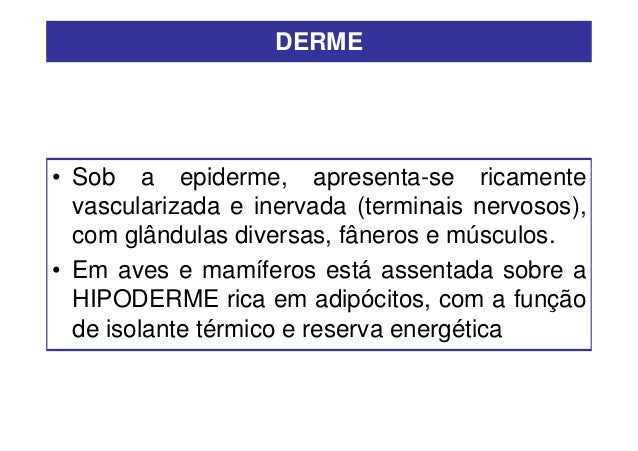 28. 28. DERME• Sob a epiderme, apresenta-se ricamente vascularizada e inervada (terminais nervosos), com glândulas diversas, fâneros e músculos.• Em aves e mamíferos está assentada sobre a HIPODERME rica em adipócitos, com a função de isolante térmico e reserva energética