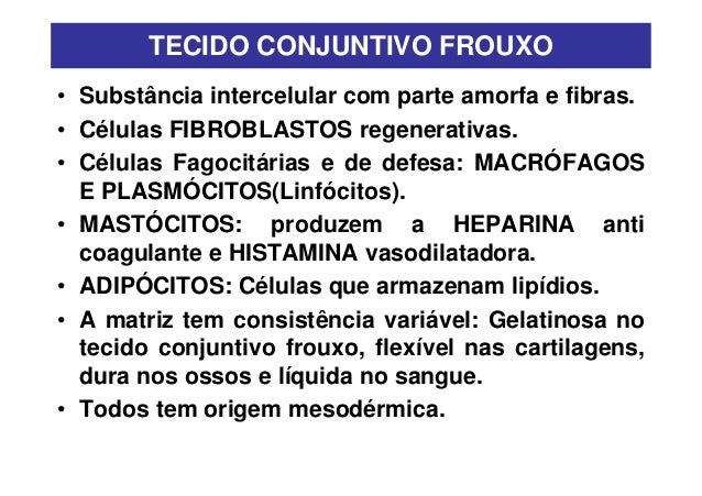 34. 34. TECIDO CONJUNTIVO FROUXO• Substância intercelular com parte amorfa e fibras.• Células FIBROBLASTOS regenerativas.• Células Fagocitárias e de defesa: MACRÓFAGOS E PLASMÓCITOS(Linfócitos).• MASTÓCITOS: produzem a HEPARINA anti coagulante e HISTAMINA vasodilatadora.• ADIPÓCITOS: Células que armazenam lipídios.• A matriz tem consistência variável: Gelatinosa no tecido conjuntivo frouxo, flexível nas cartilagens, dura nos ossos e líquida no sangue.• Todos tem origem mesodérmica.
