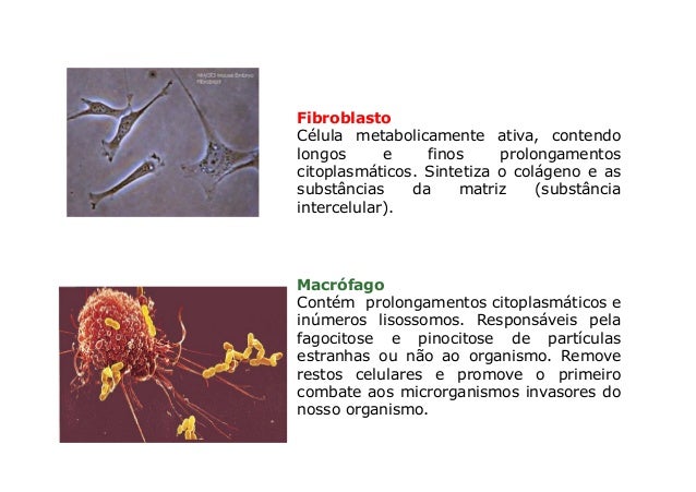 35. 35. Célula Fibroblasto Célula metabolicamente ativa, contendo longos e finos prolongamentos citoplasmáticos. Sintetiza o colágeno e as substâncias da matriz (substância intercelular). Macrófago Contém prolongamentos citoplasmáticos e inúmeros lisossomos. Responsáveis pela fagocitose e pinocitose de partículas estranhas ou não ao organismo. Remove restos celulares e promove o primeiro combate aos microrganismos invasores do nosso organismo.