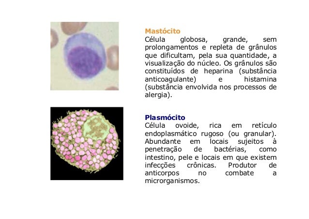 36. 36. MastócitoCélula globosa, grande, semprolongamentos e repleta de grânulosque dificultam, pela sua quantidade, avisualização do núcleo. Os grânulos sãoconstituídos de heparina (substânciaanticoagulante) e histamina(substância envolvida nos processos dealergia).PlasmócitoCélula ovoide, rica em retículoendoplasmático rugoso (ou granular).Abundante em locais sujeitos àpenetração de bactérias, comointestino, pele e locais em que existeminfecções crônicas. Produtor deanticorpos no combate amicrorganismos.