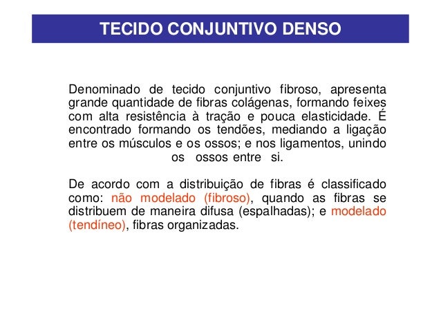 41. 41. • Modelado: formado por fibras colágenas dispostas em feixes com orientação fixa, dando ao tecido características de maior resistência à tensão do que a dos tecidos não-modelados e frouxo; ocorre nos tendões, que ligam os músculos aos ossos, e nos ligamentos, que ligam os ossos entre si.