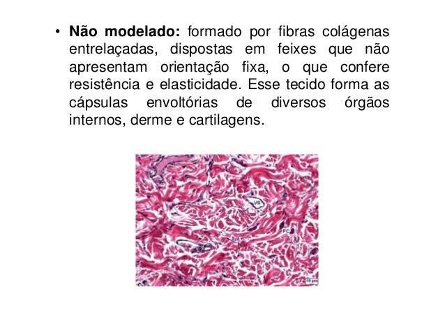 40. 40. • Não modelado: formado por fibras colágenas entrelaçadas, dispostas em feixes que não apresentam orientação fixa, o que confere resistência e elasticidade. Esse tecido forma as cápsulas envoltórias de diversos órgãos internos, derme e cartilagens.