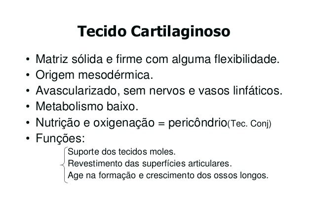 48. 48. Tecido Cartilaginoso• Matriz sólida e firme com alguma flexibilidade.• Origem mesodérmica.• Avascularizado, sem nervos e vasos linfáticos.• Metabolismo baixo.• Nutrição e oxigenação = pericôndrio(Tec. Conj)• Funções: Suporte dos tecidos moles. Revestimento das superfícies articulares. Age na formação e crescimento dos ossos longos.