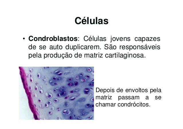 50. 50. Células• Condroblastos: Células jovens capazes de se auto duplicarem. São responsáveis pela produção de matriz cartilaginosa. Depois de envoltos pela matriz passam a se chamar condrócitos.