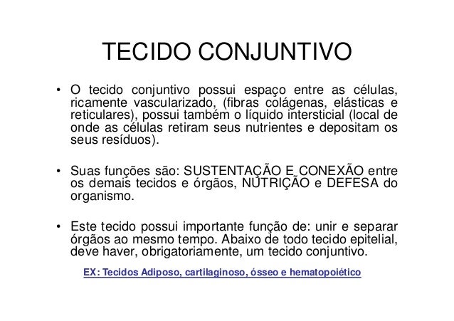 5. 5. TECIDO CONJUNTIVO• O tecido conjuntivo possui espaço entre as células, ricamente vascularizado, (fibras colágenas, elásticas e reticulares), possui também o líquido intersticial (local de onde as células retiram seus nutrientes e depositam os seus resíduos).• Suas funções são: SUSTENTAÇÃO E CONEXÃO entre os demais tecidos e órgãos, NUTRIÇÃO e DEFESA do organismo.• Este tecido possui importante função de: unir e separar órgãos ao mesmo tempo. Abaixo de todo tecido epitelial, deve haver, obrigatoriamente, um tecido conjuntivo. EX: Tecidos Adiposo, cartilaginoso, ósseo e hematopoiético