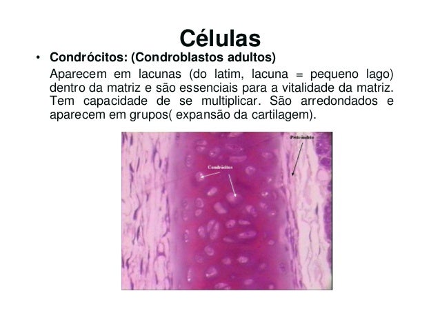 51. 51. Células• Condrócitos: (Condroblastos adultos) Aparecem em lacunas (do latim, lacuna = pequeno lago) dentro da matriz e são essenciais para a vitalidade da matriz. Tem capacidade de se multiplicar. São arredondados e aparecem em grupos( expansão da cartilagem).