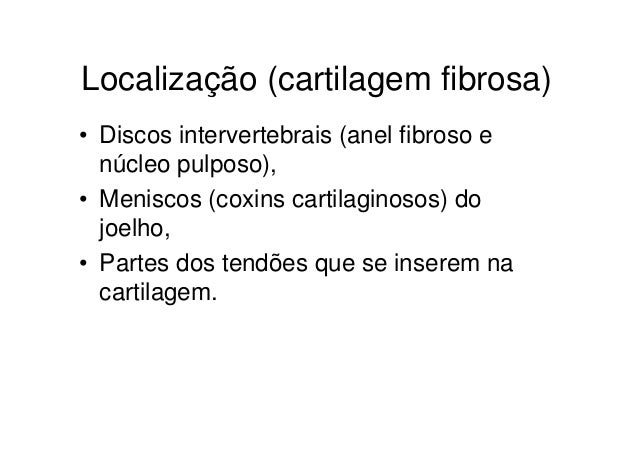 61. 61. Localização (cartilagem fibrosa)• Discos intervertebrais (anel fibroso e núcleo pulposo),• Meniscos (coxins cartilaginosos) do joelho,• Partes dos tendões que se inserem na cartilagem.