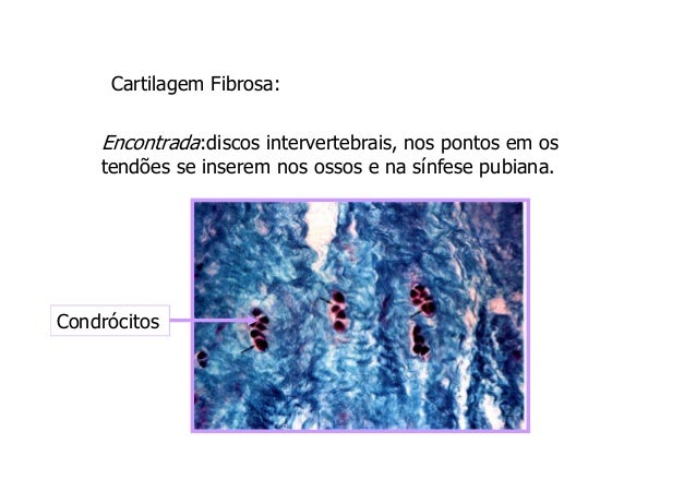 62. 62. Cartilagem Fibrosa: Encontrada:discos intervertebrais, nos pontos em os tendões se inserem nos ossos e na sínfese pubiana.Condrócitos