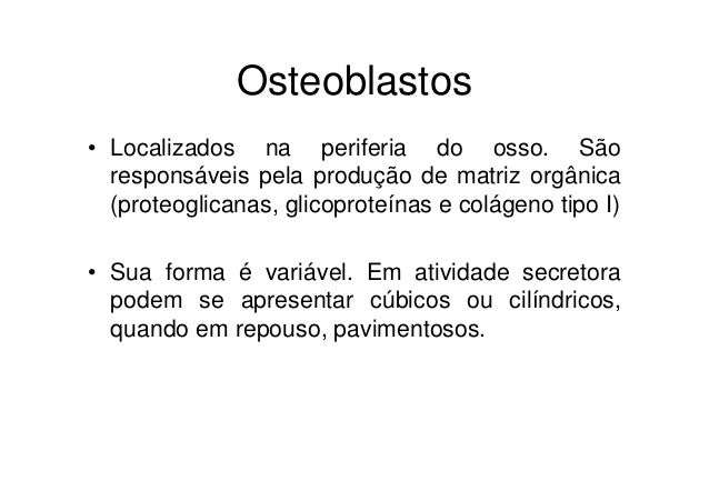 67. 67. Osteoblastos• Localizados na periferia do osso. São responsáveis pela produção de matriz orgânica (proteoglicanas, glicoproteínas e colágeno tipo I)• Sua forma é variável. Em atividade secretora podem se apresentar cúbicos ou cilíndricos, quando em repouso, pavimentosos.