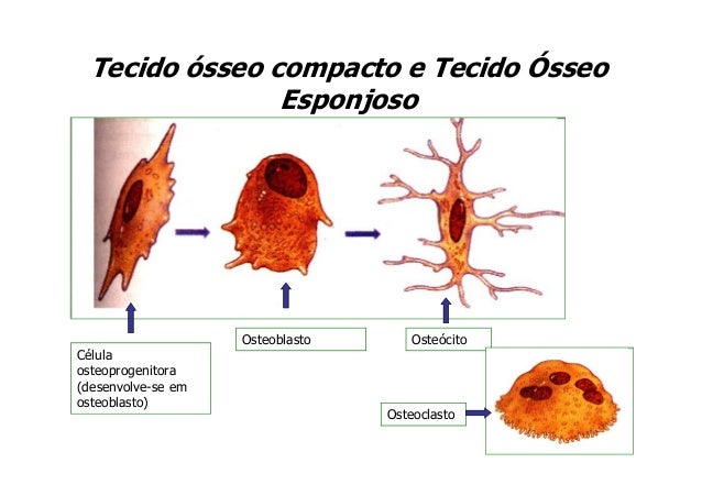 70. 70. Tecido ósseo compacto e Tecido Ósseo Esponjoso Osteoblasto OsteócitoCélulaosteoprogenitora(desenvolve-se emosteoblasto) Osteoclasto