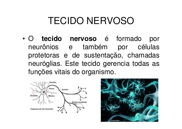 7. 7. TECIDO NERVOSO• O tecido nervoso é formado por neurônios e também por células protetoras e de sustentação, chamadas neuróglias. Este tecido gerencia todas as funções vitais do organismo.