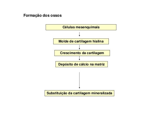 77. 77. Formação dos ossos Células mesenquimais Molde de cartilagem hialina Crescimento da cartilagem Depósito de cálcio na matriz Substituição da cartilagem mineralizada