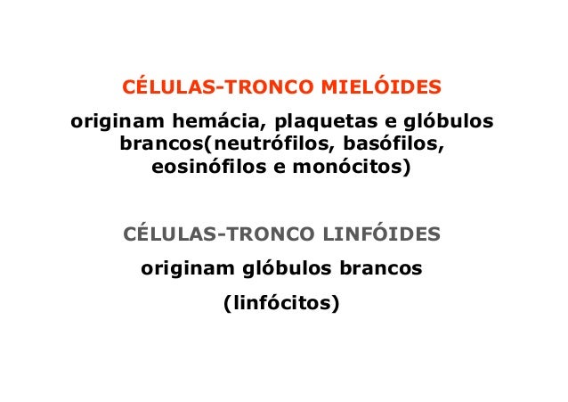85. 85. Diferenciações das células-tronco: CÉLULAS-TRONCO MIELÓIDESoriginam hemácia, plaquetas e glóbulos brancos(neutrófilos, basófilos, eosinófilos e monócitos) CÉLULAS-TRONCO LINFÓIDES originam glóbulos brancos (linfócitos)