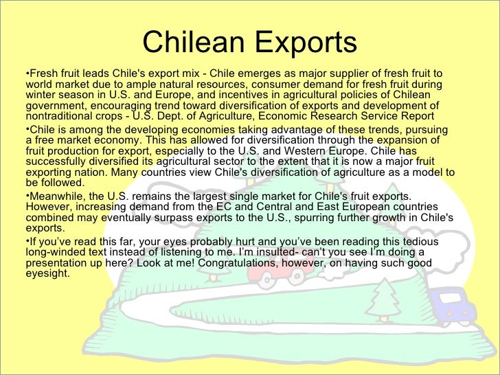 3. 3. Chilean Exports•Fresh fruit leads Chiles export mix - Chile emerges as major supplier of fresh fruit toworld market due to ample natural resources, consumer demand for fresh fruit duringwinter season in U.S. and Europe, and incentives in agricultural policies of Chileangovernment, encouraging trend toward diversification of exports and development ofnontraditional crops - U.S. Dept. of Agriculture, Economic Research Service Report•Chile is among the developing economies taking advantage of these trends, pursuinga free market economy. This has allowed for diversification through the expansion offruit production for export, especially to the U.S. and Western Europe. Chile hassuccessfully diversified its agricultural sector to the extent that it is now a major fruitexporting nation. Many countries view Chiles diversification of agriculture as a model tobe followed.•Meanwhile, the U.S. remains the largest single market for Chiles fruit exports.However, increasing demand from the EC and Central and East European countriescombined may eventually surpass exports to the U.S., spurring further growth in Chilesexports.•If you’ve read this far, your eyes probably hurt and you’ve been reading this tediouslong-winded text instead of listening to me. I’m insulted- can’t you see I’m doing apresentation up here? Look at me! Congratulations, however, on having such goodeyesight.