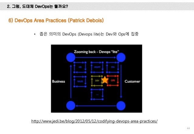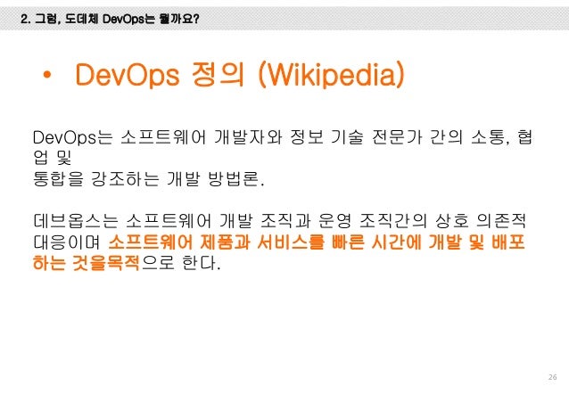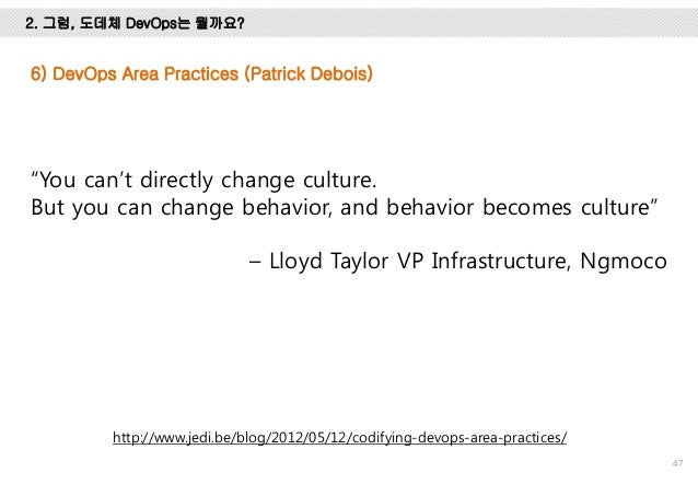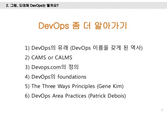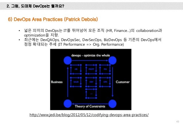 위메프에서 DevOps를 적용하기 위해서 공부하고 경험했던 내용을 정리한 자료입니다. DevOps를 왜 해야 하는 지, 그리고, 정확히 DevOps가 뭔지 이해하기 위해서 DevOps의 유래, CAMS/CALMS, 또, Gene Kim의 The three ways와 Patrick의 4 Areas에 대해서 설명하고 DevOps의 다양한 패턴에 대해서 설명했습니다.