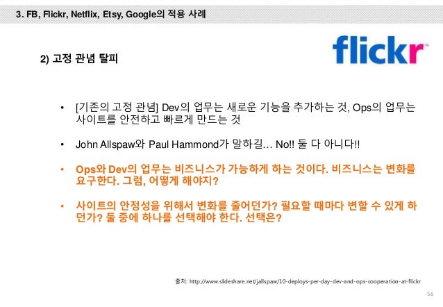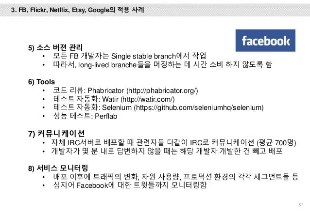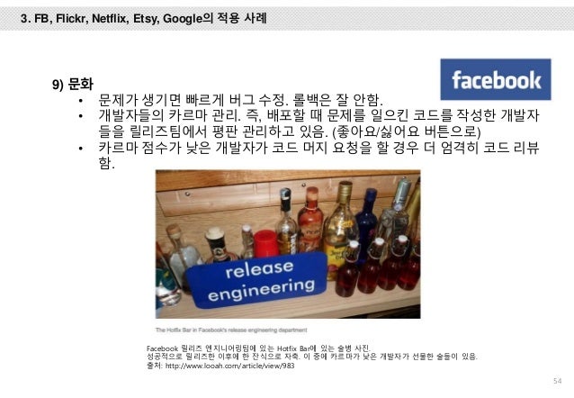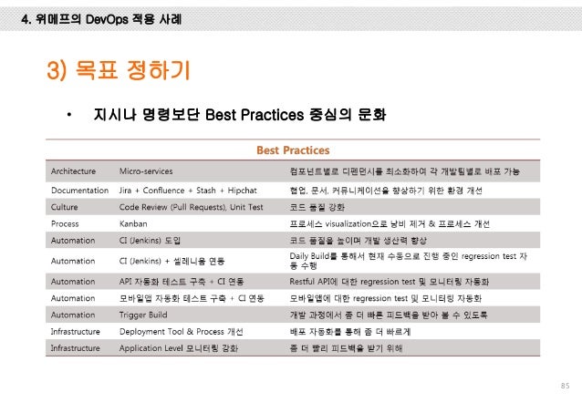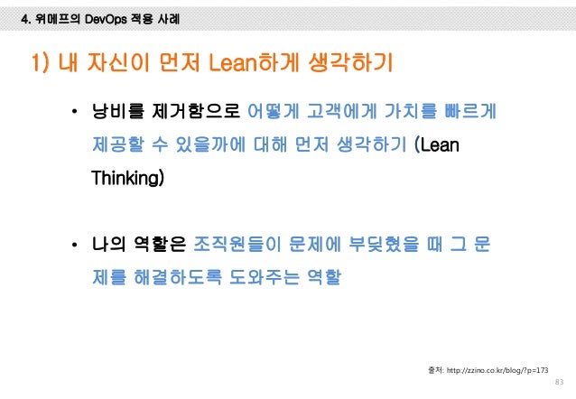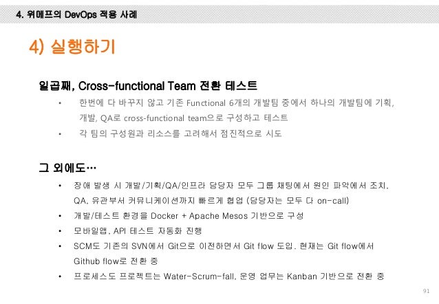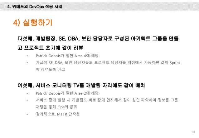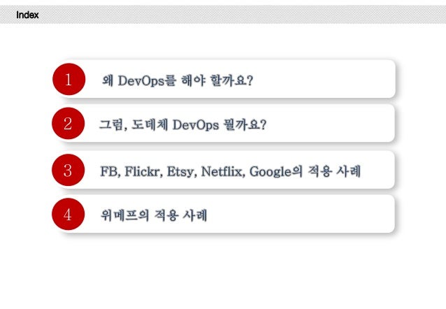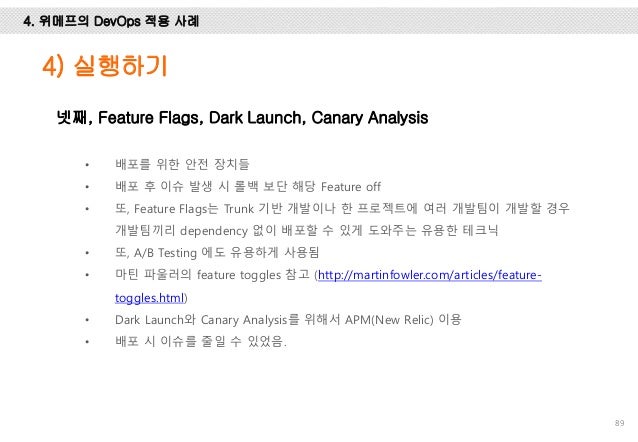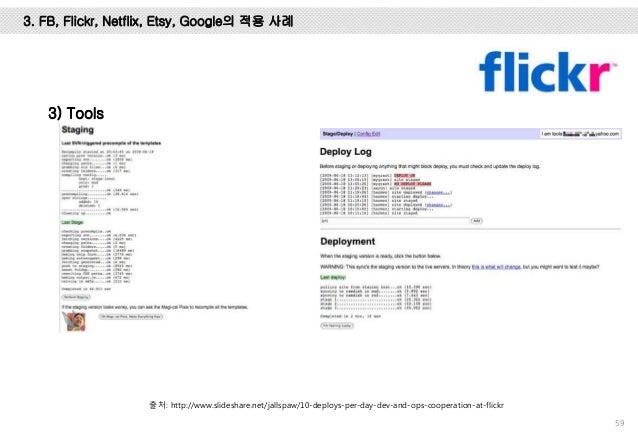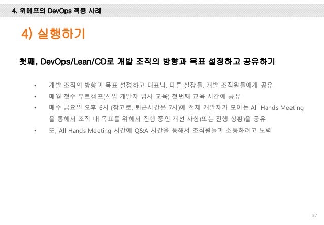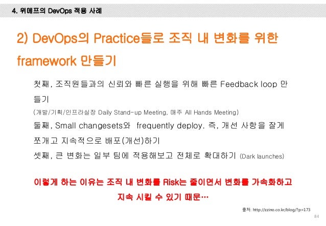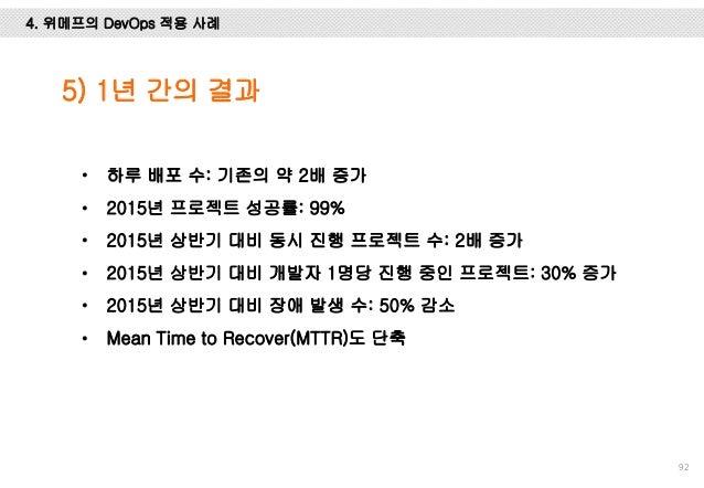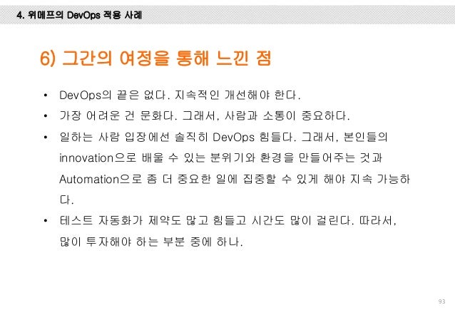 그리고, Facebook, Flickr, Etsy, Netflix, Google에서는 어떻게 개발하고 배포 하는 지 사례를 설명 드리고 마지막엔 위메프에서 1년 동안 DevOps를 적용하기 위해 어떤 노력들을 했는 지 설명하려 노력했습니다.