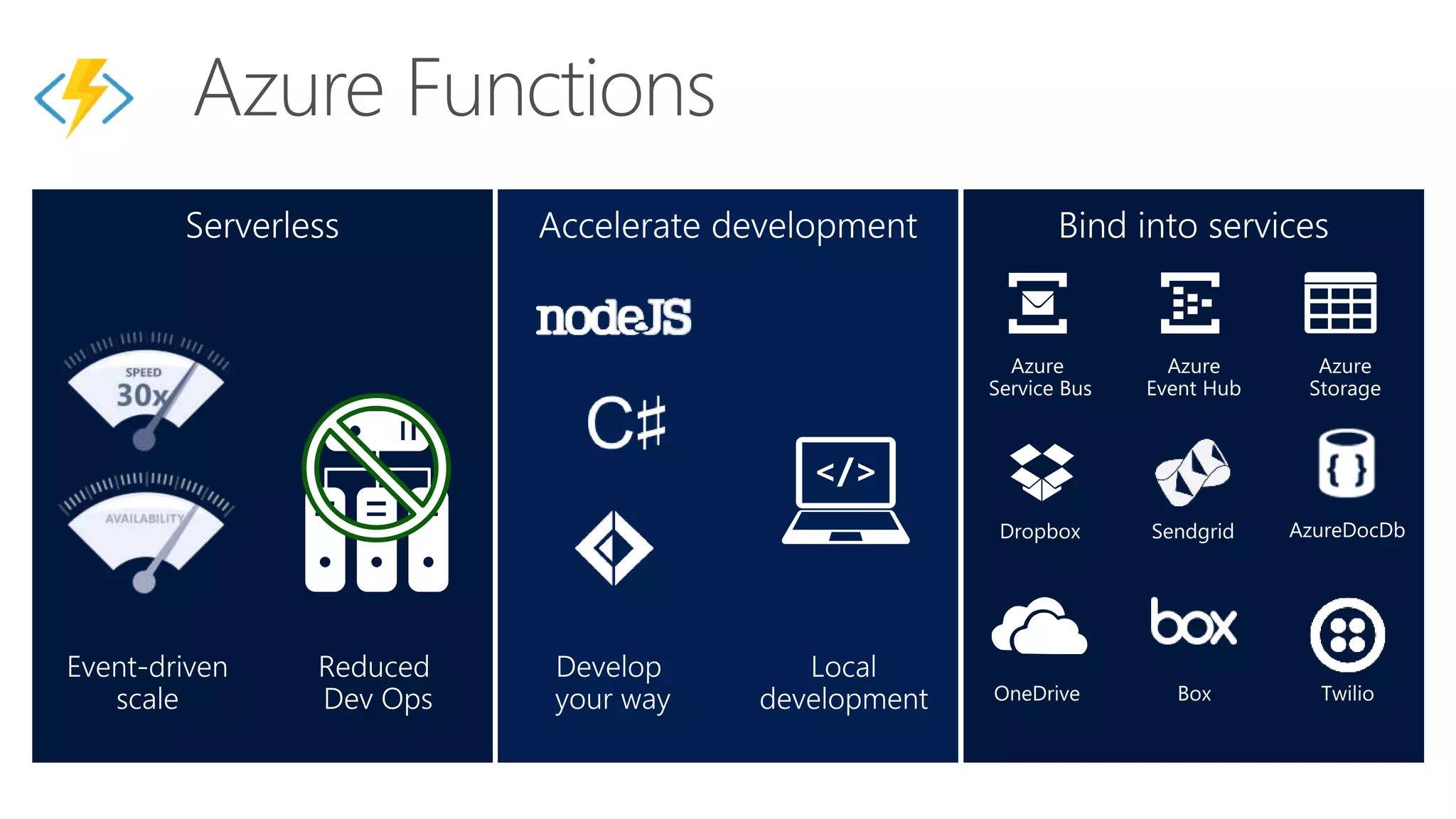 Serverless compute with Azure Functions abstracts away infrastructure management and allows developers to focus on writing code for triggered operations. Azure Functions supports bindings to data sources and services that avoid writing boilerplate integration code, and can be deployed and managed via the Azure Functions runtime, CLI tools, templates and samples on GitHub.