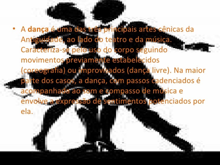 2. 2. <ul><li>A dança é uma das três principais artes cênicas da Antiguidade, ao lado do teatro e da música. Caracteriza-se pelo uso do corpo seguindo movimentos previamente estabelecidos (coreografia) ou improvisados (dança livre). Na maior parte dos casos, a dança, com passos cadenciados é acompanhada ao som e compasso de música e envolve a expressão de sentimentos potenciados por ela. </li></ul>