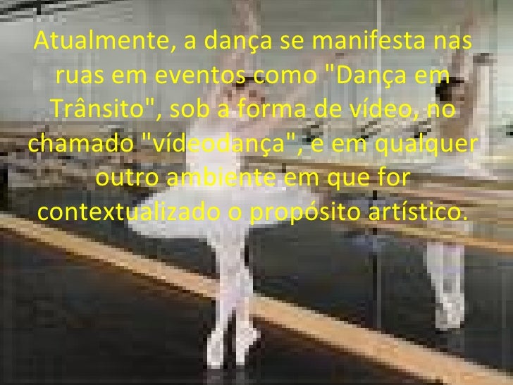 4. 4. Atualmente, a dança se manifesta nas ruas em eventos como &quot;Dança em Trânsito&quot;, sob a forma de vídeo, no chamado &quot;vídeodança&quot;, e em qualquer outro ambiente em que for contextualizado o propósito artístico.