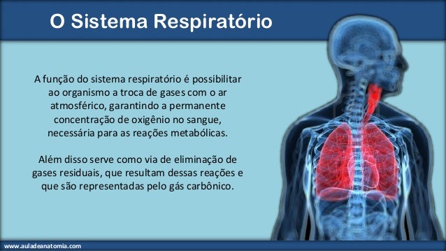 2. 2. O Sistema Respiratório A função do sistema respiratório é possibilitar ao organismo a troca de gases com o ar atmosférico, garantindo a permanente concentração de oxigênio no sangue, necessária para as reações metabólicas. Além disso serve como via de eliminação de gases residuais, que resultam dessas reações e que são representadas pelo gás carbônico. www.auladeanatomia.com