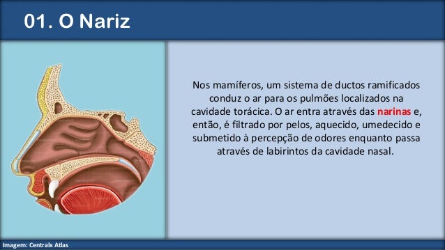 3. 3. 01. O Nariz Imagem: Centralx Atlas Nos mamíferos, um sistema de ductos ramificados conduz o ar para os pulmões localizados na cavidade torácica. O ar entra através das narinas e, então, é filtrado por pelos, aquecido, umedecido e submetido à percepção de odores enquanto passa através de labirintos da cavidade nasal.