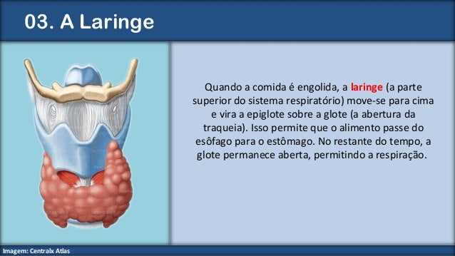 5. 5. 03. A Laringe Imagem: Centralx Atlas Quando a comida é engolida, a laringe (a parte superior do sistema respiratório) move-se para cima e vira a epiglote sobre a glote (a abertura da traqueia). Isso permite que o alimento passe do esôfago para o estômago. No restante do tempo, a glote permanece aberta, permitindo a respiração.