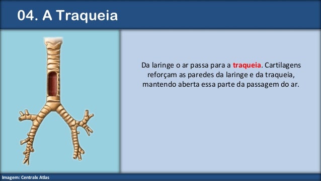 6. 6. 04. A Traqueia Imagem: Centralx Atlas Da laringe o ar passa para a traqueia. Cartilagens reforçam as paredes da laringe e da traqueia, mantendo aberta essa parte da passagem do ar.