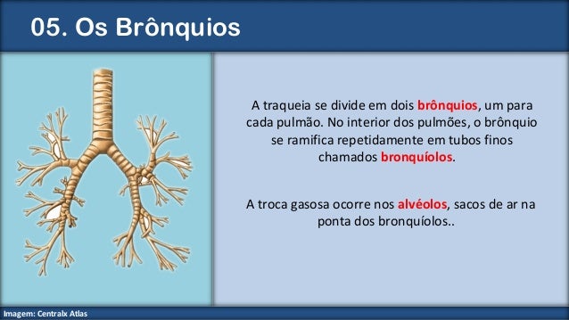 7. 7. 05. Os Brônquios Imagem: Centralx Atlas A traqueia se divide em dois brônquios, um para cada pulmão. No interior dos pulmões, o brônquio se ramifica repetidamente em tubos finos chamados bronquíolos. A troca gasosa ocorre nos alvéolos, sacos de ar na ponta dos bronquíolos..