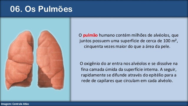 8. 8. 06. Os Pulmões Imagem: Centralx Atlas O pulmão humano contém milhões de alvéolos, que juntos possuem uma superfície de cerca de 100 m², cinquenta vezes maior do que a área da pele. O oxigênio do ar entra nos alvéolos e se dissolve na fina camada úmida da superfície interna. A seguir, rapidamente se difunde através do epitélio para a rede de capilares que circulam em cada alvéolo.
