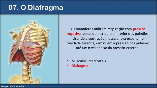 9. 9. 07. O Diafragma Imagem: Centralx Atlas Os mamíferos utilizam respiração com pressão negativa, puxando o ar para o interior dos pulmões. Usando a contração muscular pra expandir a cavidade torácica, diminuem a pressão nos pulmões até um nível abaixo da pressão externa. • Músculos intercostais • Diafragma