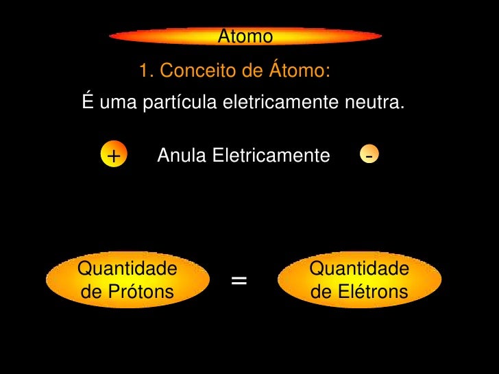 13. 13. Átomo 1. Conceito de Átomo:É uma partícula eletricamente neutra. + Anula Eletricamente -Quantidade Quantidadede Prótons = de Elétrons