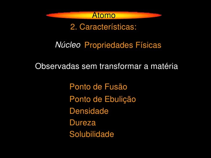 15. 15. Átomo 2. Características: Núcleo Propriedades FísicasObservadas sem transformar a matéria Ponto de Fusão Ponto de Ebulição Densidade Dureza Solubilidade