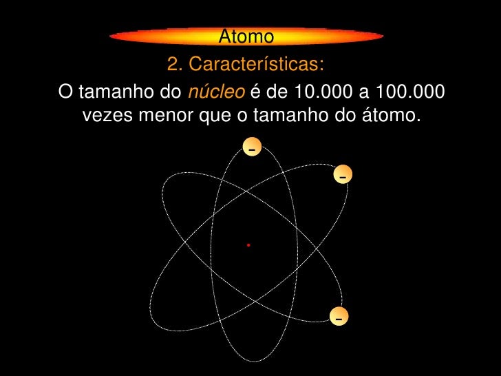 18. 18. Átomo 2. Características:O tamanho do núcleo é de 10.000 a 100.000 vezes menor que o tamanho do átomo. - - -
