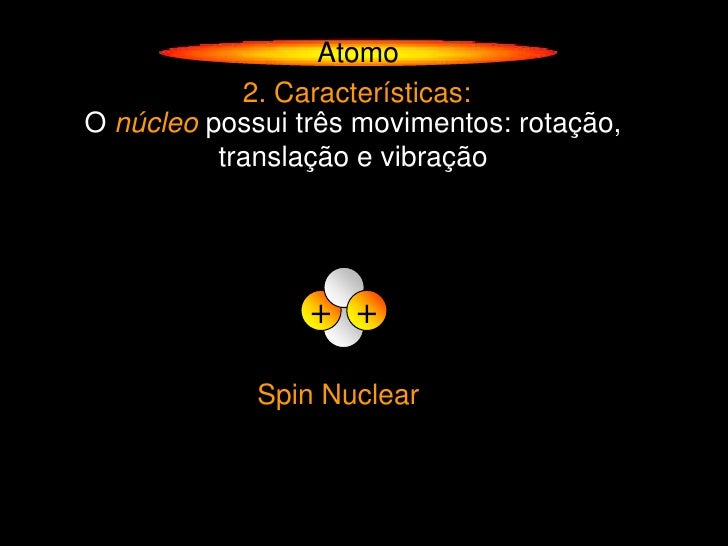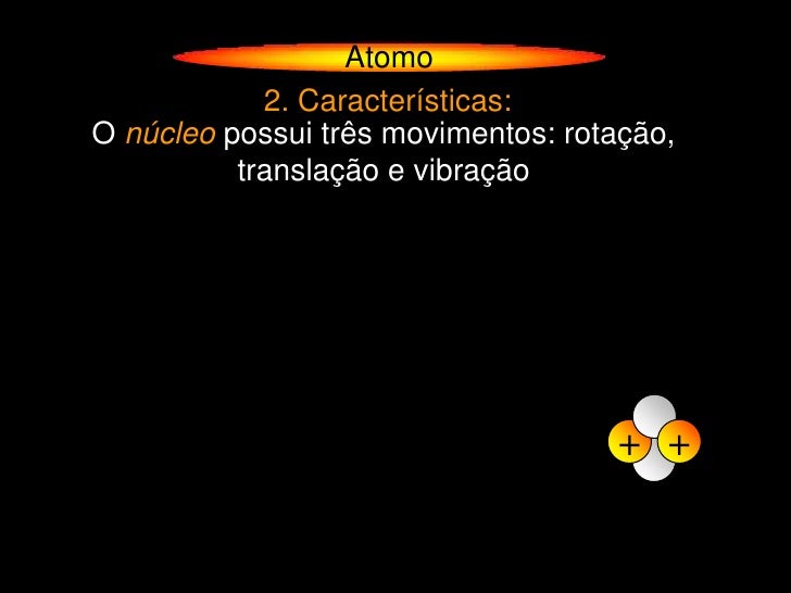 19. 19. Átomo 2. Características:O núcleo possui três movimentos: rotação, translação e vibração + +