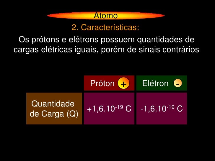 21. 21. Átomo 2. Características: Os prótons e elétrons possuem quantidades decargas elétricas iguais, porém de sinais contrários + Próton (P) - Elétron (e) Quantidade +1,6.10-19 C -1,6.10-19 C de Carga (Q)