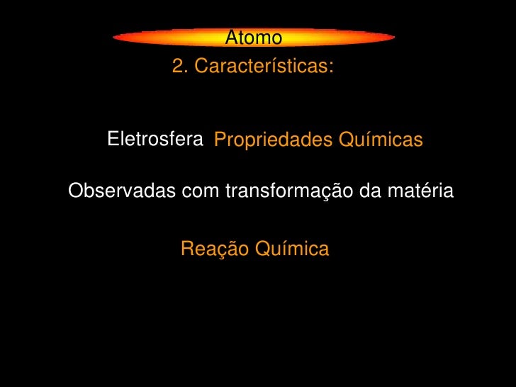 22. 22. Átomo 2. Características: Eletrosfera Propriedades QuímicasObservadas com transformação da matéria Reação Química